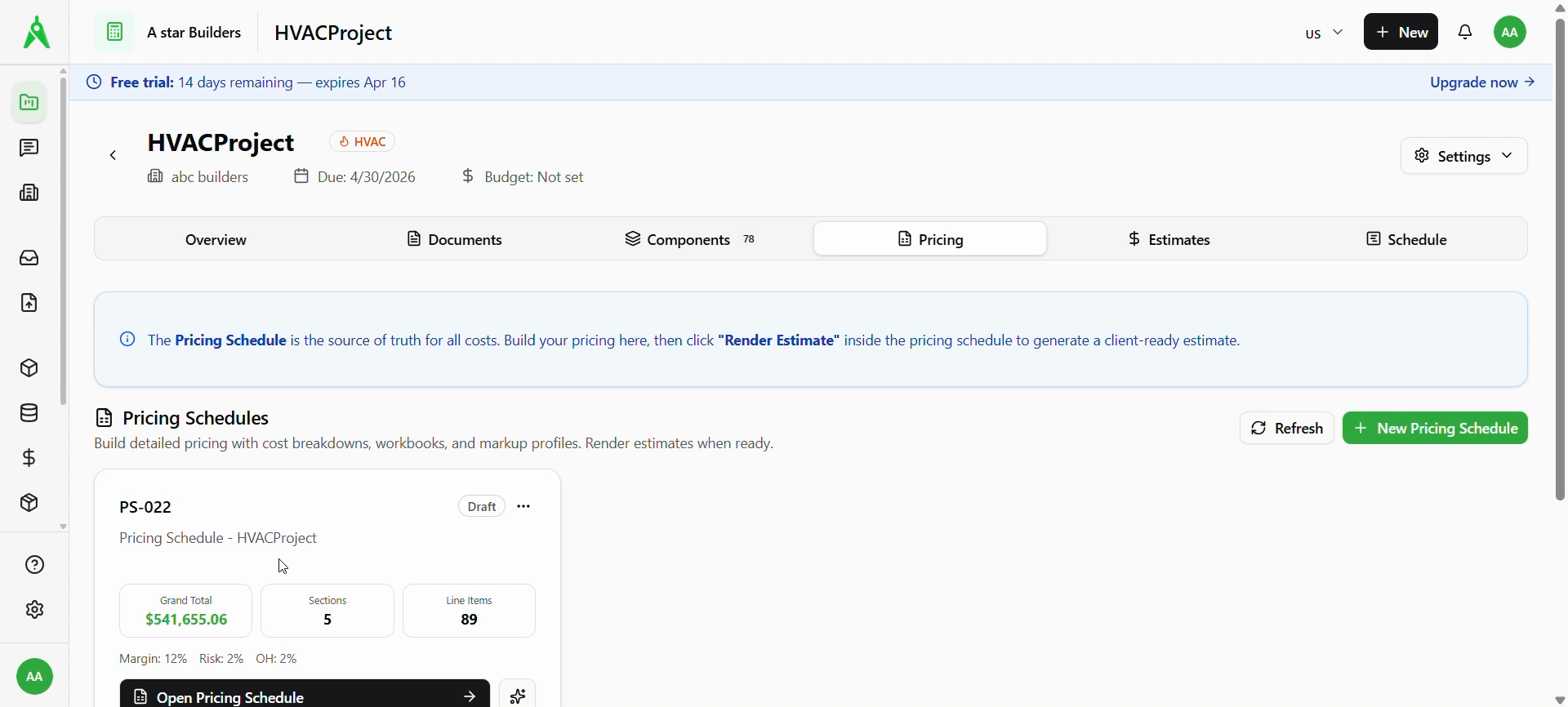Open the project Pricing tab. The banner explains that the pricing schedule drives costs and that you Render Estimate from inside the schedule to produce a client-ready estimate.