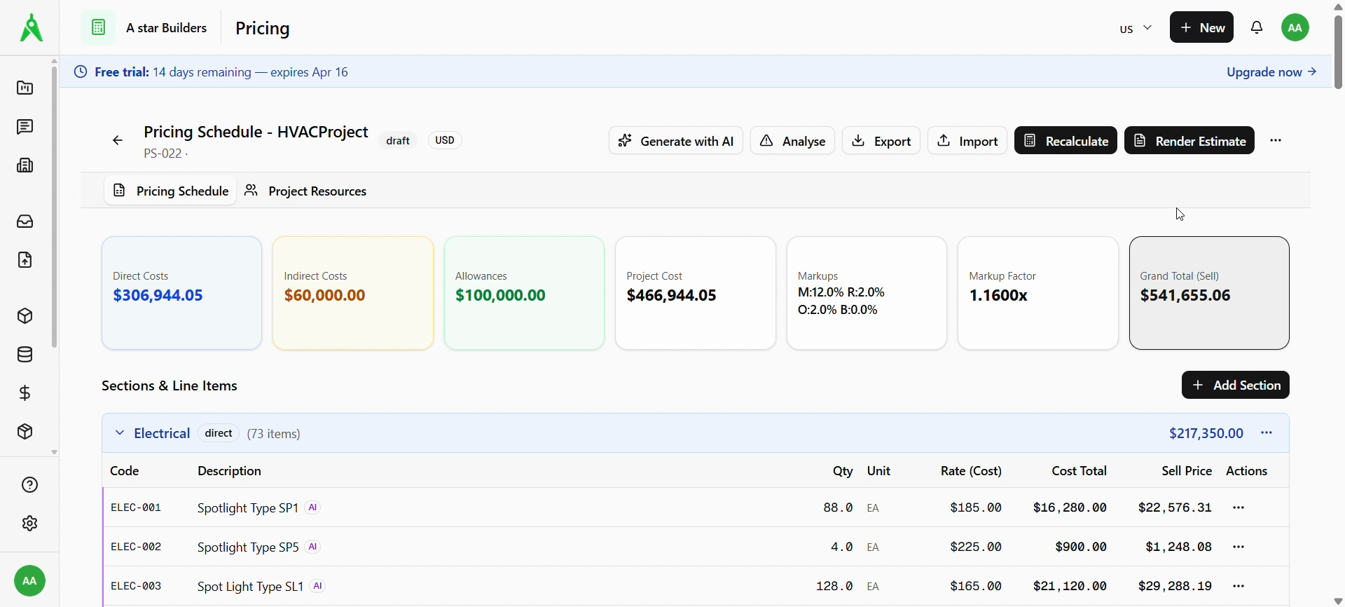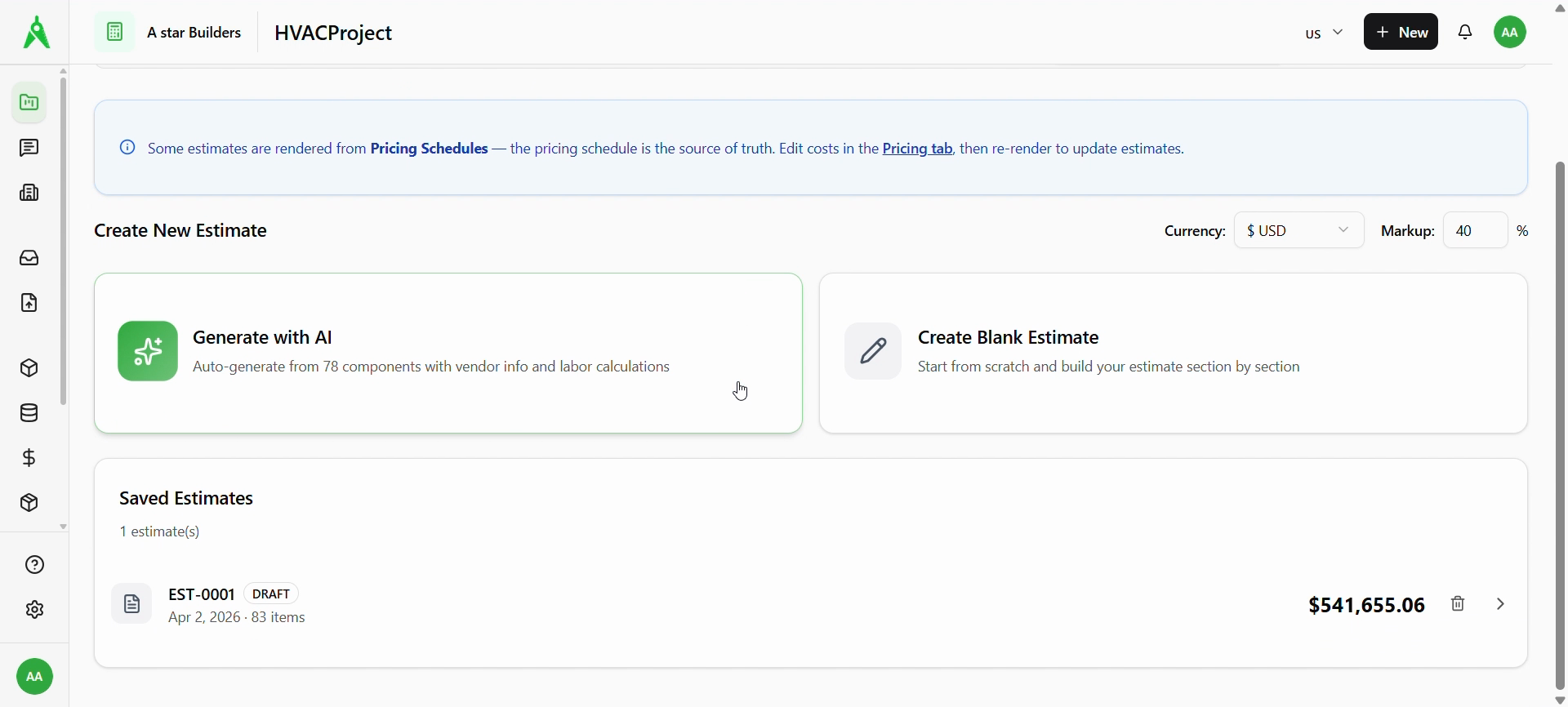 Create a new estimate with Generate with AI (pulls from project components where configured) or Create Blank Estimate. Set Currency and Markup as needed for new drafts.