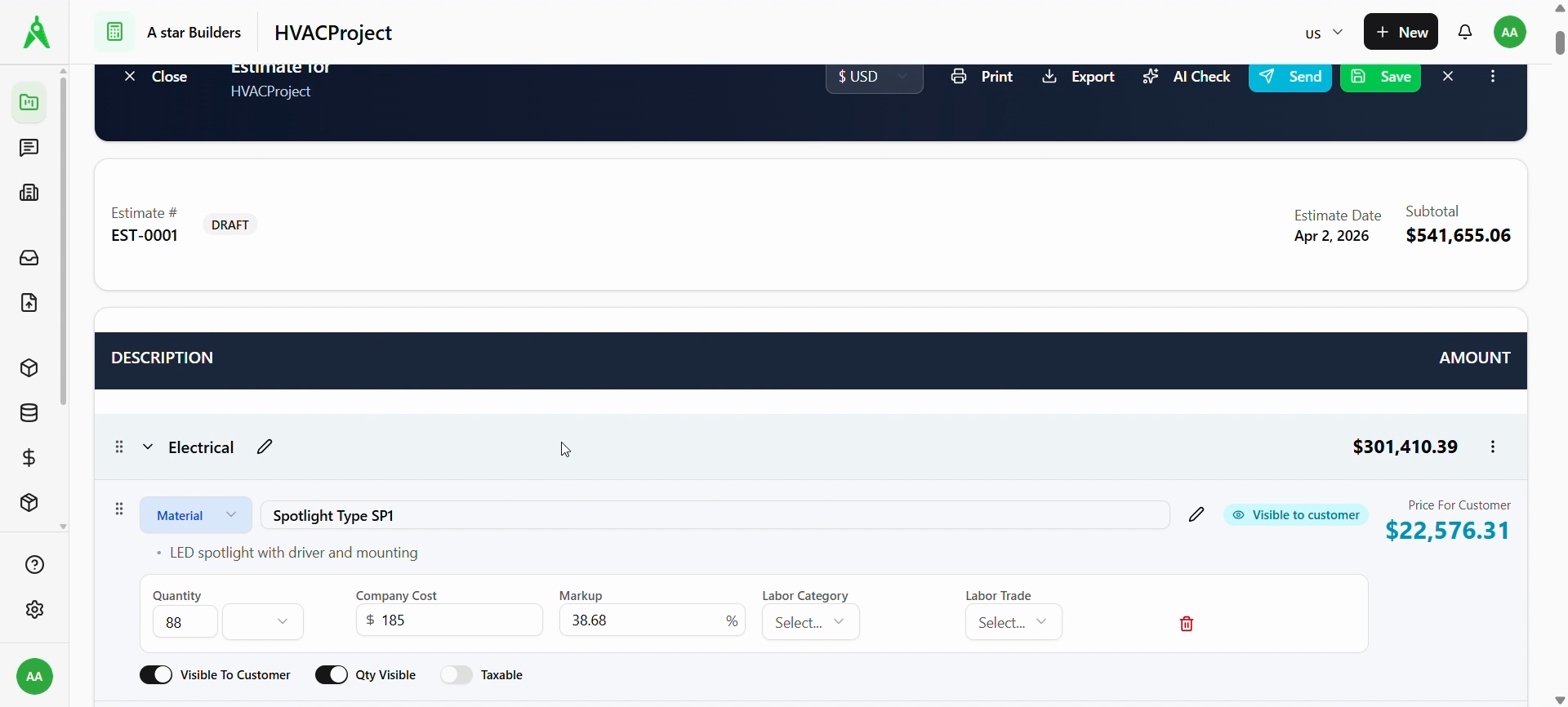Open an estimate to see Estimate #, status (e.g. DRAFT), date, and Subtotal. Line items are grouped by sections (e.g. Electrical) with customer pricing, quantity, cost, markup, and visibility toggles (Visible to customer, Qty Visible, Taxable).