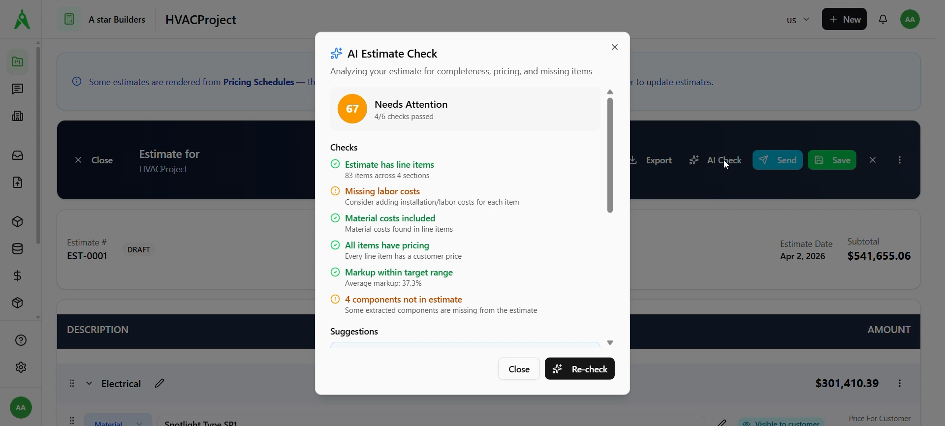 Choose AI Check to open an audit of completeness and pricing (score, passed/warning checks, suggestions). Use Re-check after you fix issues.
