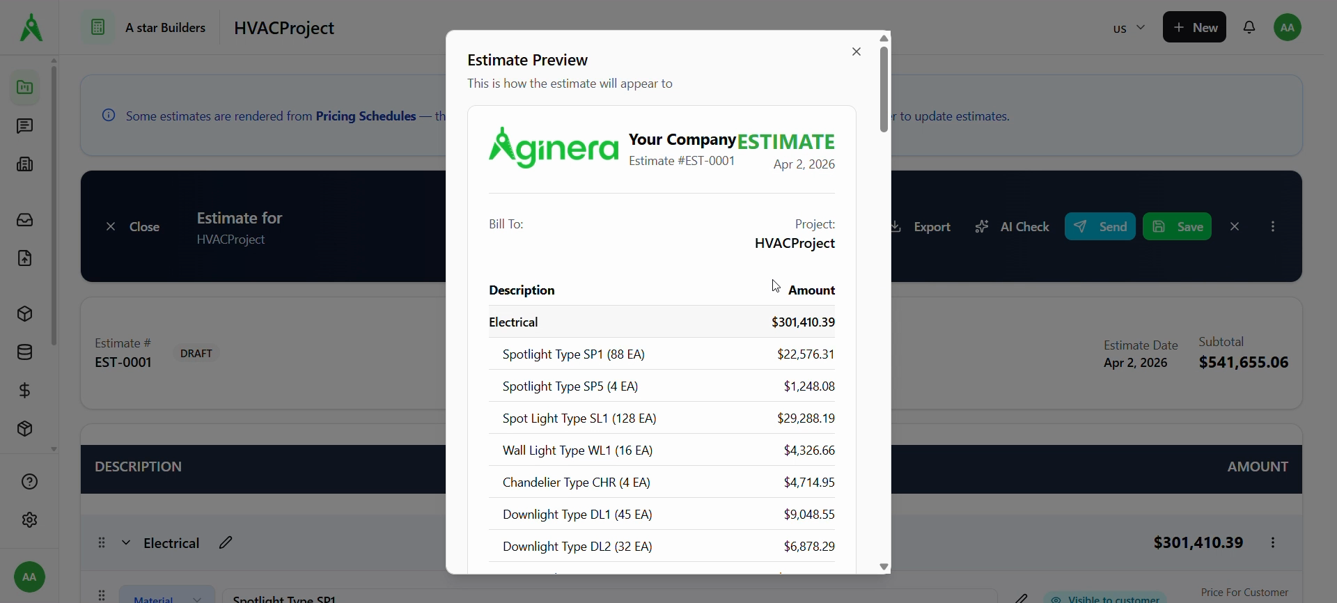 In Aginera, estimates are tied to your pricing schedule (source of truth for costs). You finalize numbers in Pricing, use Render Estimate to create or refresh an estimate document, then open the Estimates tab to review, run AI Check, Preview, and Send to the customer.
