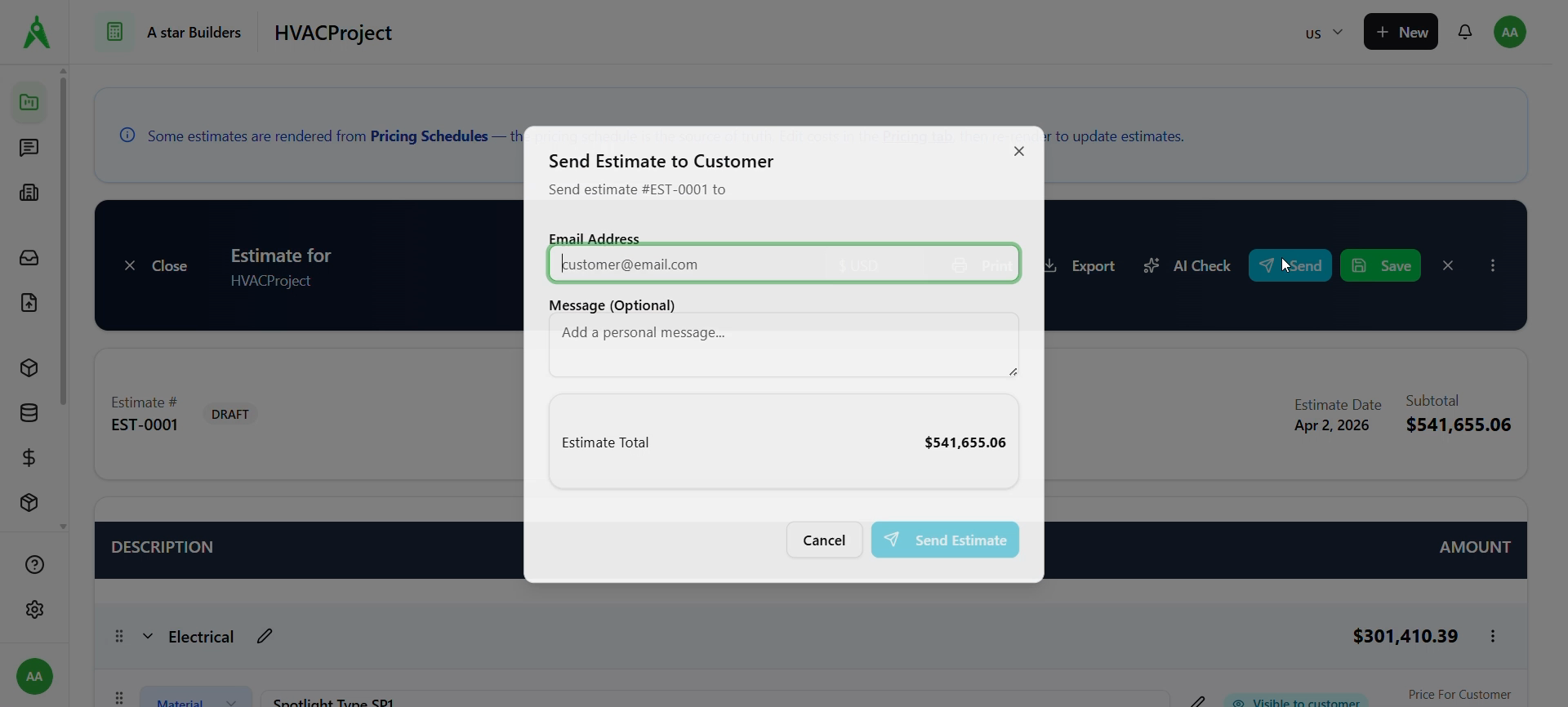 - Send opens Send Estimate to Customer: enter email, optional message, confirm the total, then send.
