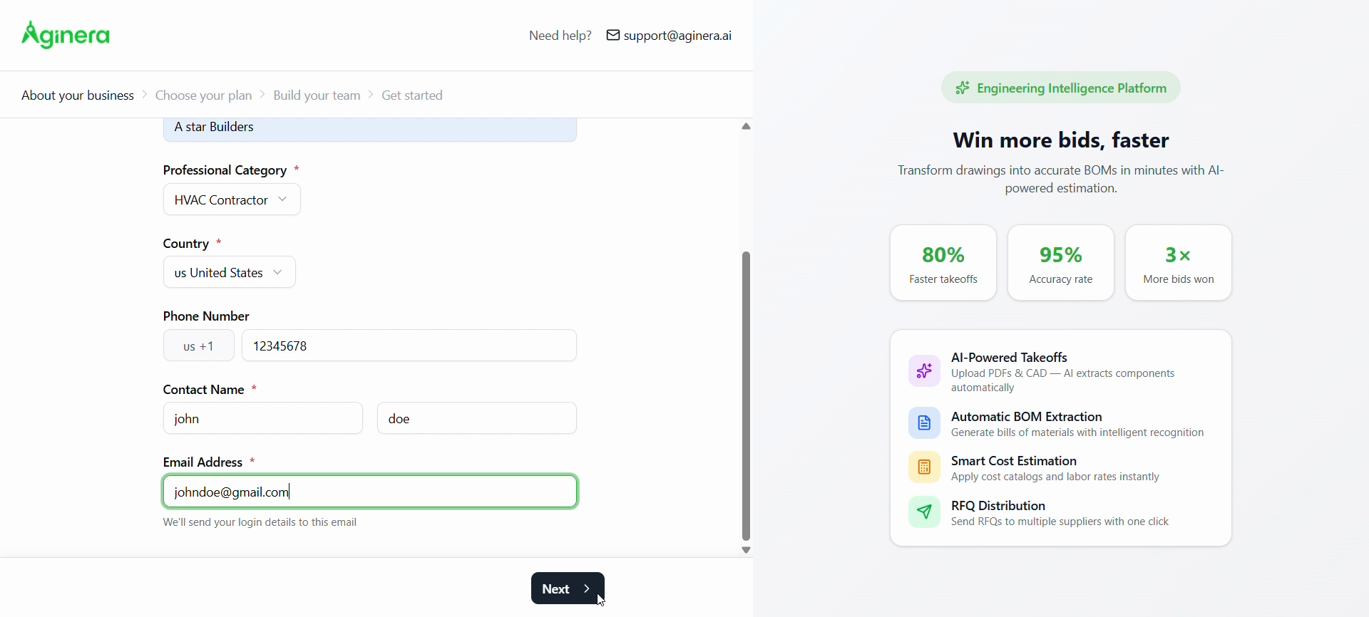 About your business — Enter business name, Professional category, Country, phone (optional), Contact name, and Email address. Aginera sends login details to that email. Choose Next.