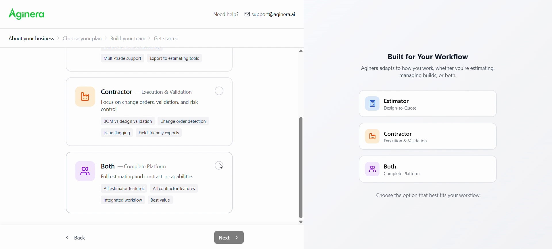 Built for your workflow — Pick Estimator, Contractor, or Both depending on how you use the platform, then Next.