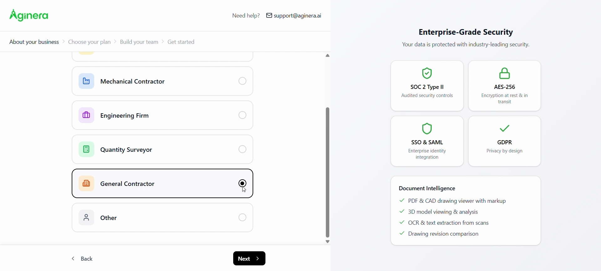 - No email with login details: Check spam; confirm the email on the summary step; contact support@aginera.ai (also linked from onboarding screens).