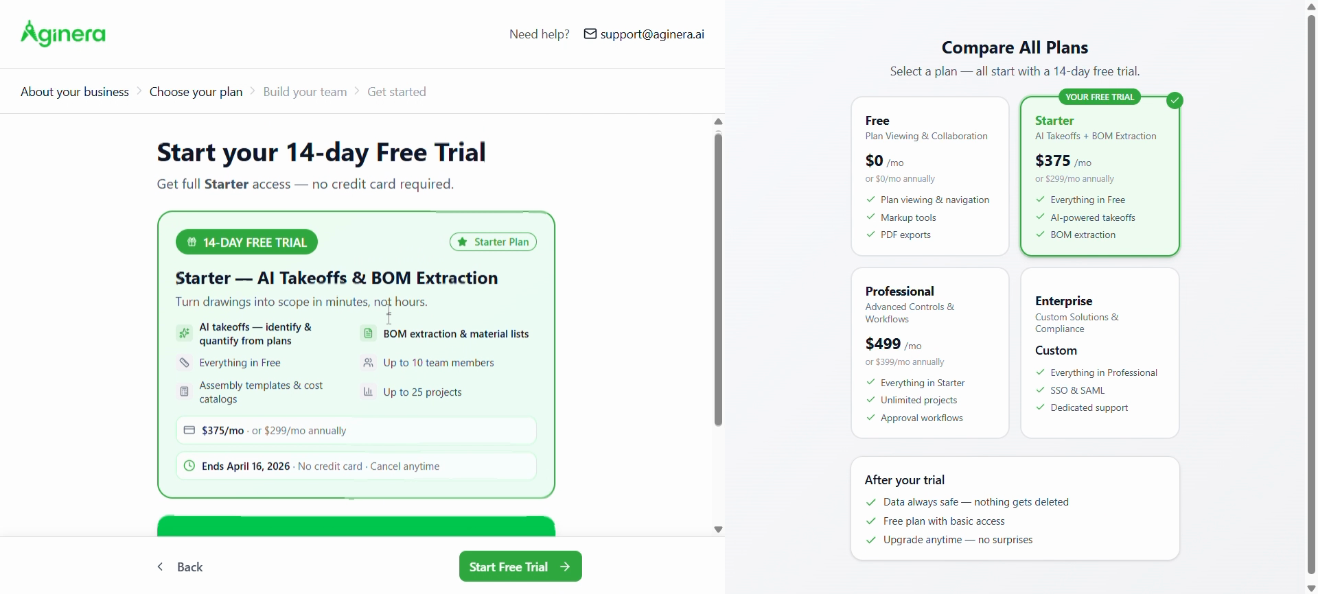 Choose your plan — Review tiers and start the 14-day free trial (e.g. Starter) with Start Free Trial, or compare plans on the right. No credit card is required for the trial as shown on this screen.