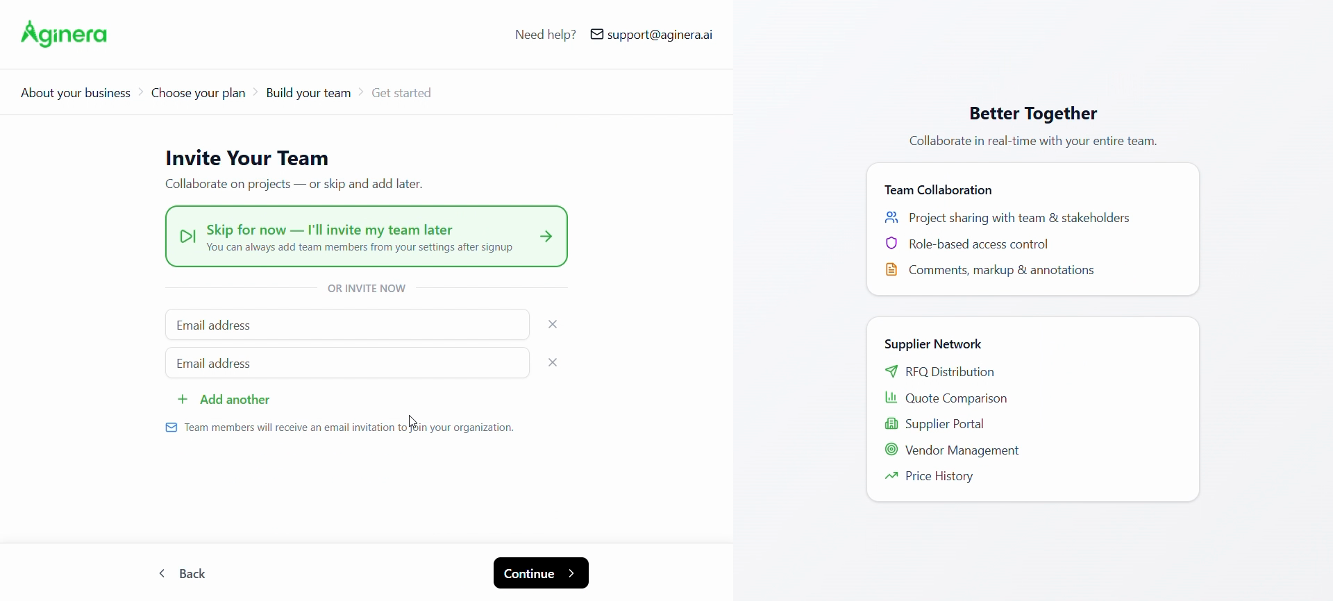 Build your team — Invite teammates by email, or use Skip for now and add people later from Settings. Choose Continue.