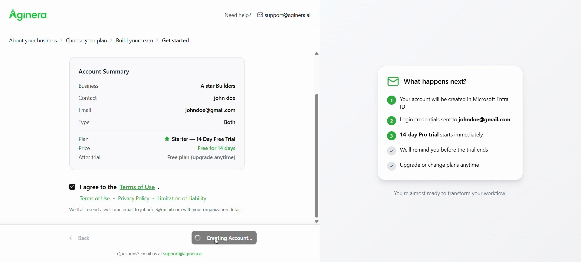 Get started — Review the summary (business, contact, plan, trial). Accept Terms of Use (and related policies), then submit. Wait until account creation finishes; you’ll receive email with next steps.
