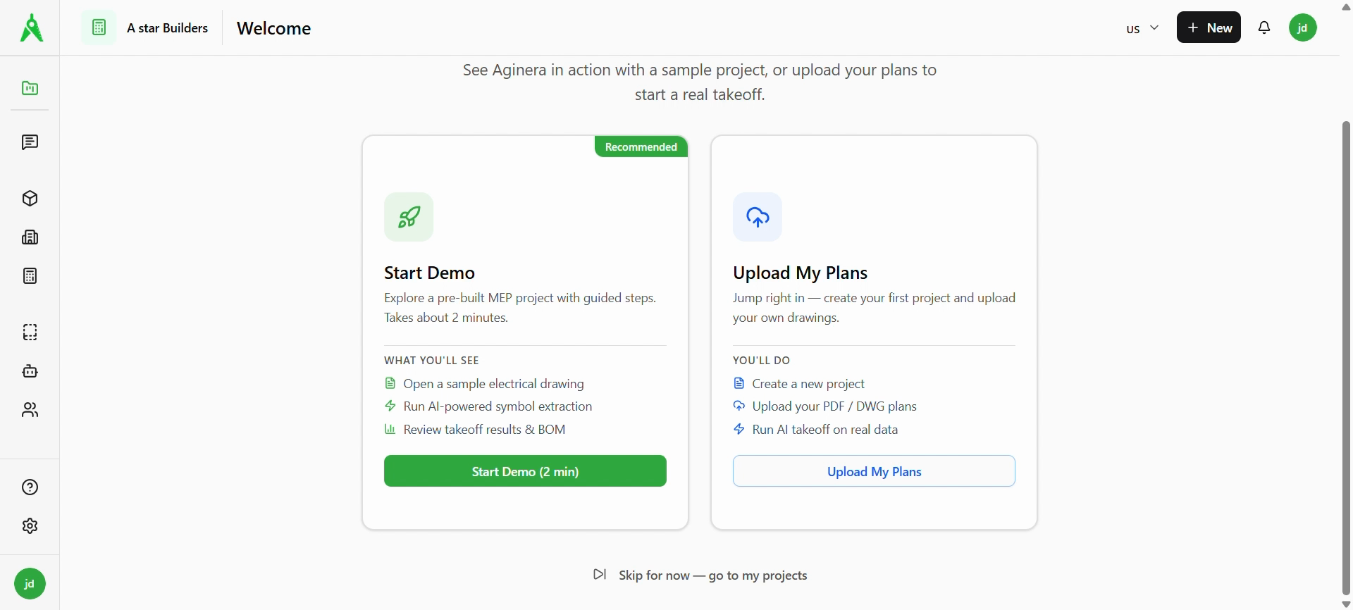 - You reach the Welcome page and can start a demo, upload plans, or go straight to projects.