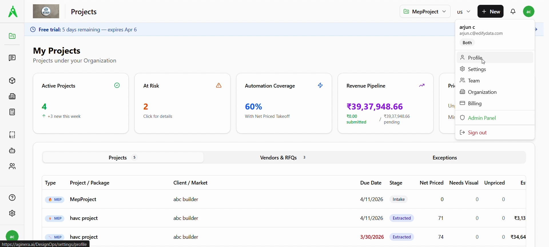Under Settings → Personal, you manage your own account: profile (name, photo, phone, formats), appearance (theme, accent, font, density), and notifications (email test mode, channels, quiet hours). You can also open Profile from the header avatar menu.
