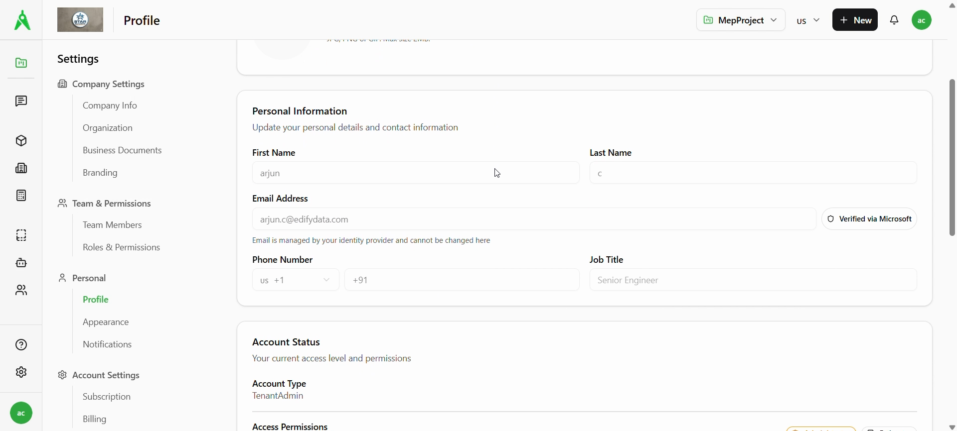When editing, update First name, Last name, Phone, and Job title as needed. Email is often read-only when managed by your identity provider (e.g. Verified via Microsoft). Account Status shows your role (e.g. TenantAdmin).