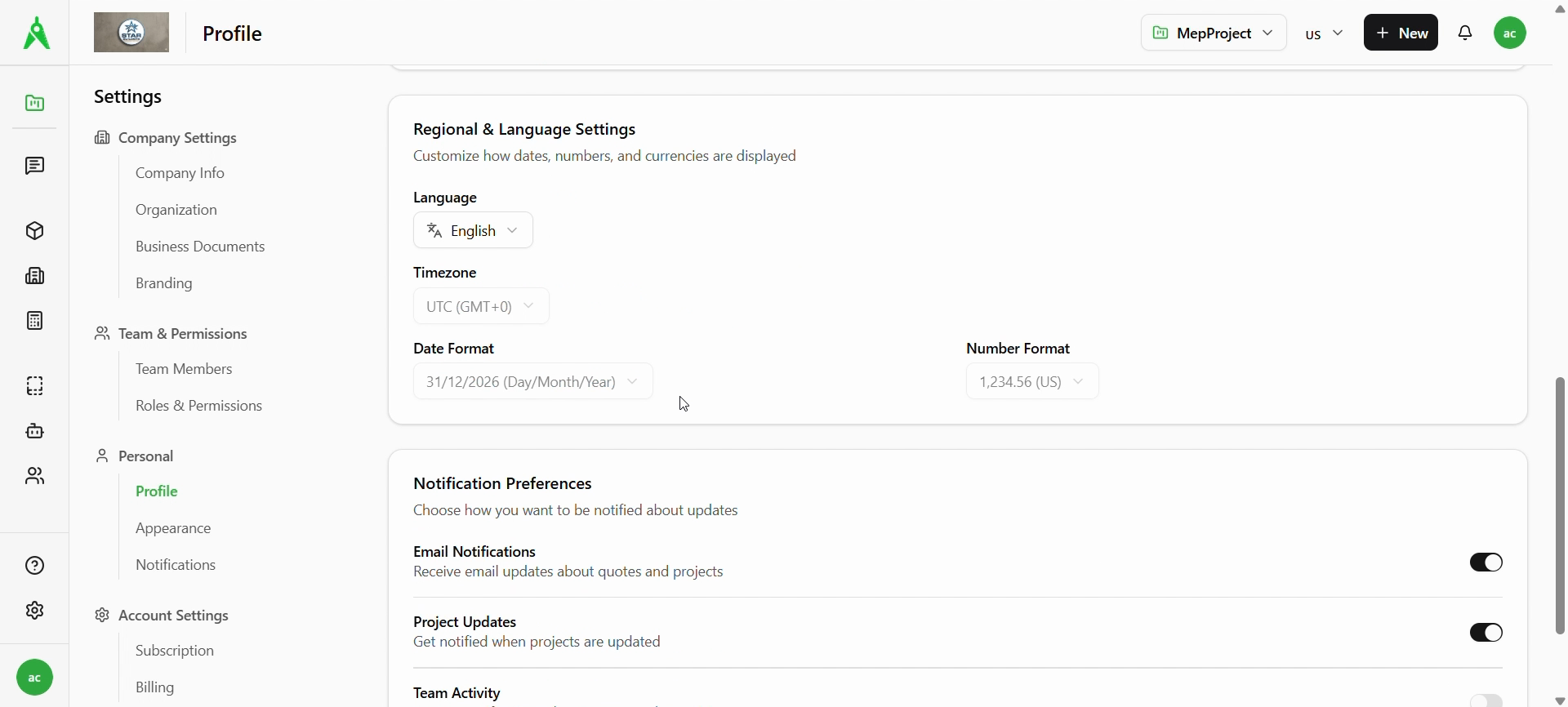 On the same Profile area, set Language, Timezone (if editable), Date format, and Number format. Use the toggles for Email notifications, Project updates, and Team activity as you prefer.