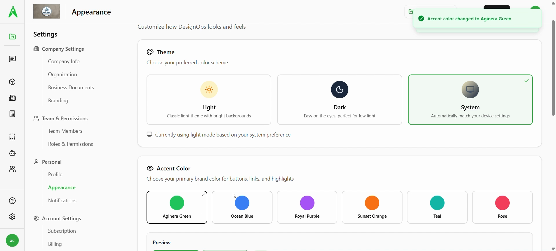 Go to Settings → Personal → Appearance. Pick Light, Dark, or System theme, then choose an Accent color (e.g. Aginera Green). A confirmation toast may appear when the accent updates.