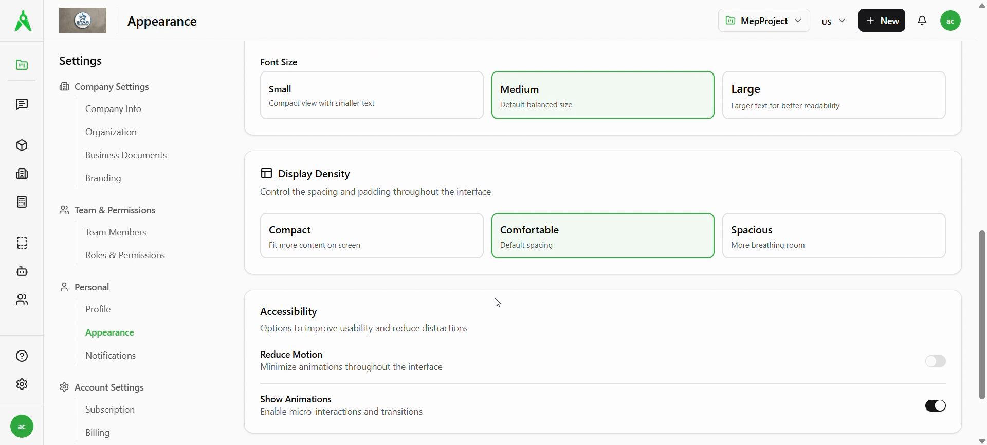 Set Font size (Small / Medium / Large), Display density (Compact / Comfortable / Spacious), and toggles such as Reduce motion and Show animations.