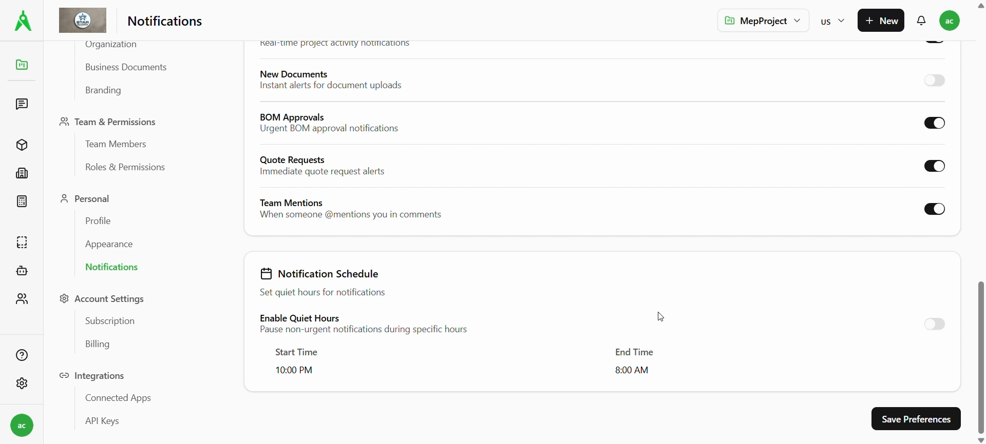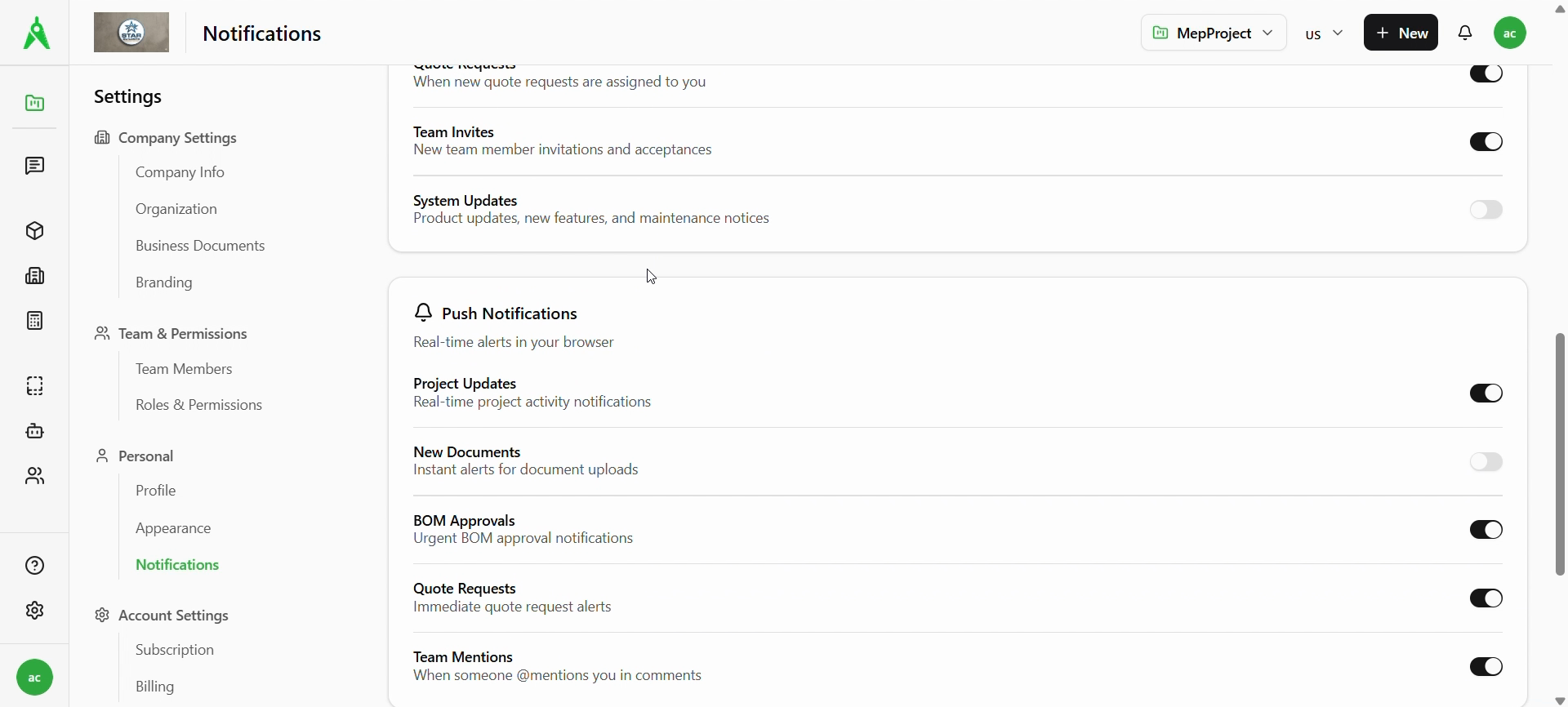 Turn categories on or off (e.g. Quote requests, Team invites, System updates) and configure Push notifications for project updates, documents, BOM approvals, quotes, and mentions.