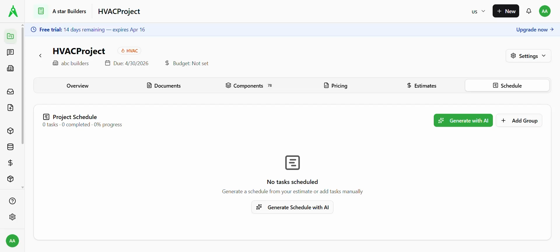 Select the Schedule tab. If nothing is built yet, you see an empty state: No tasks scheduled, with Generate Schedule with AI (or Generate with AI in the toolbar) and + Add Group to build the plan manually.