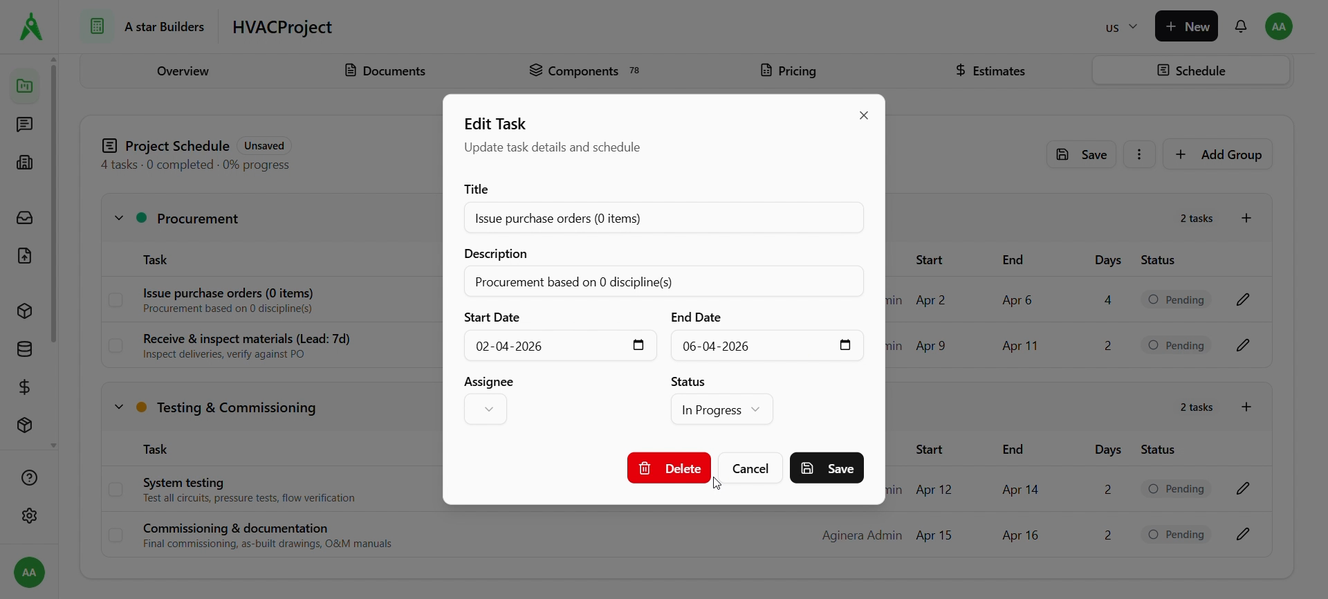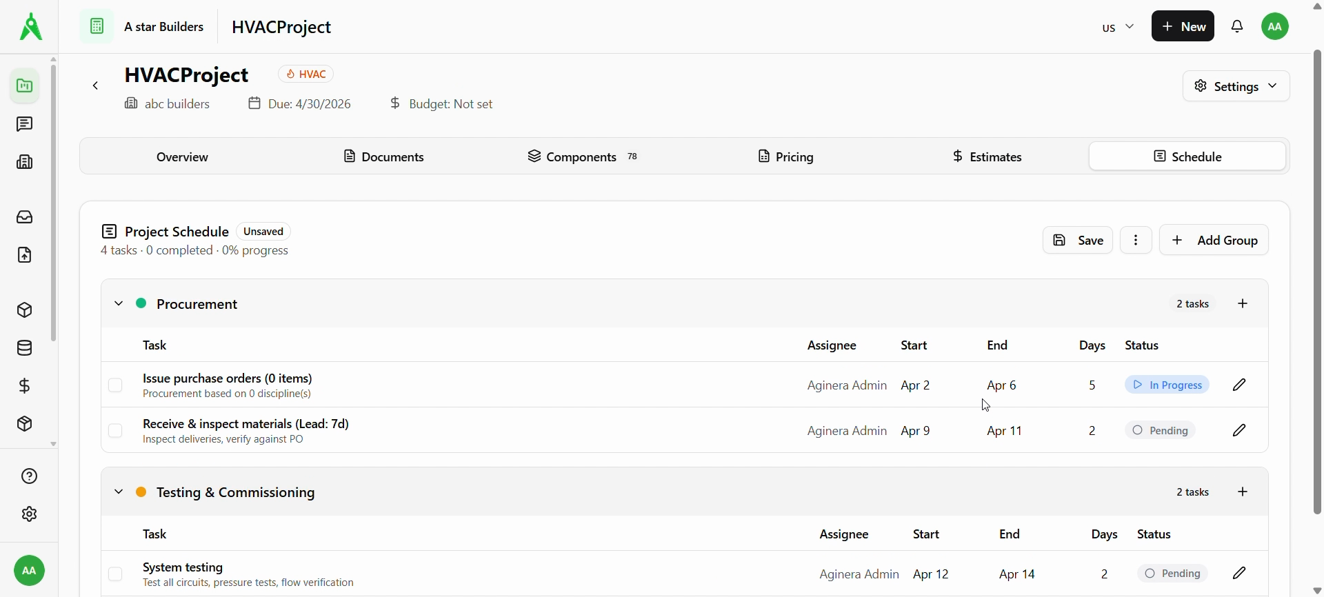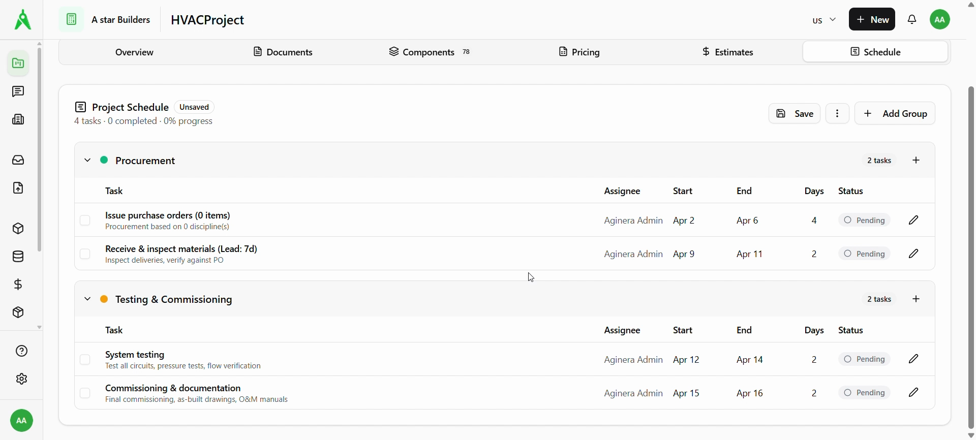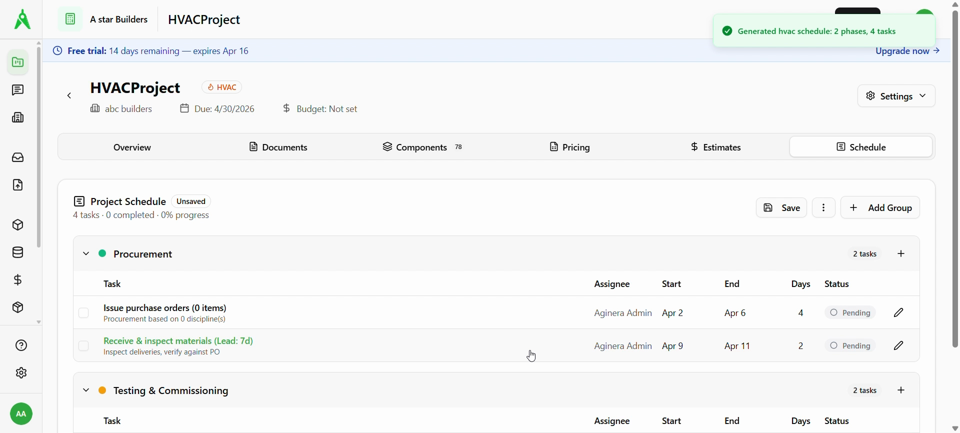 Choose Generate Schedule with AI / Generate with AI. When generation finishes, a confirmation may appear (e.g. phases and task count). The Project Schedule shows groups such as Procurement and Testing & Commissioning, each with tasks, dates, and Pending (or other) status. The schedule may show Unsaved until you save.