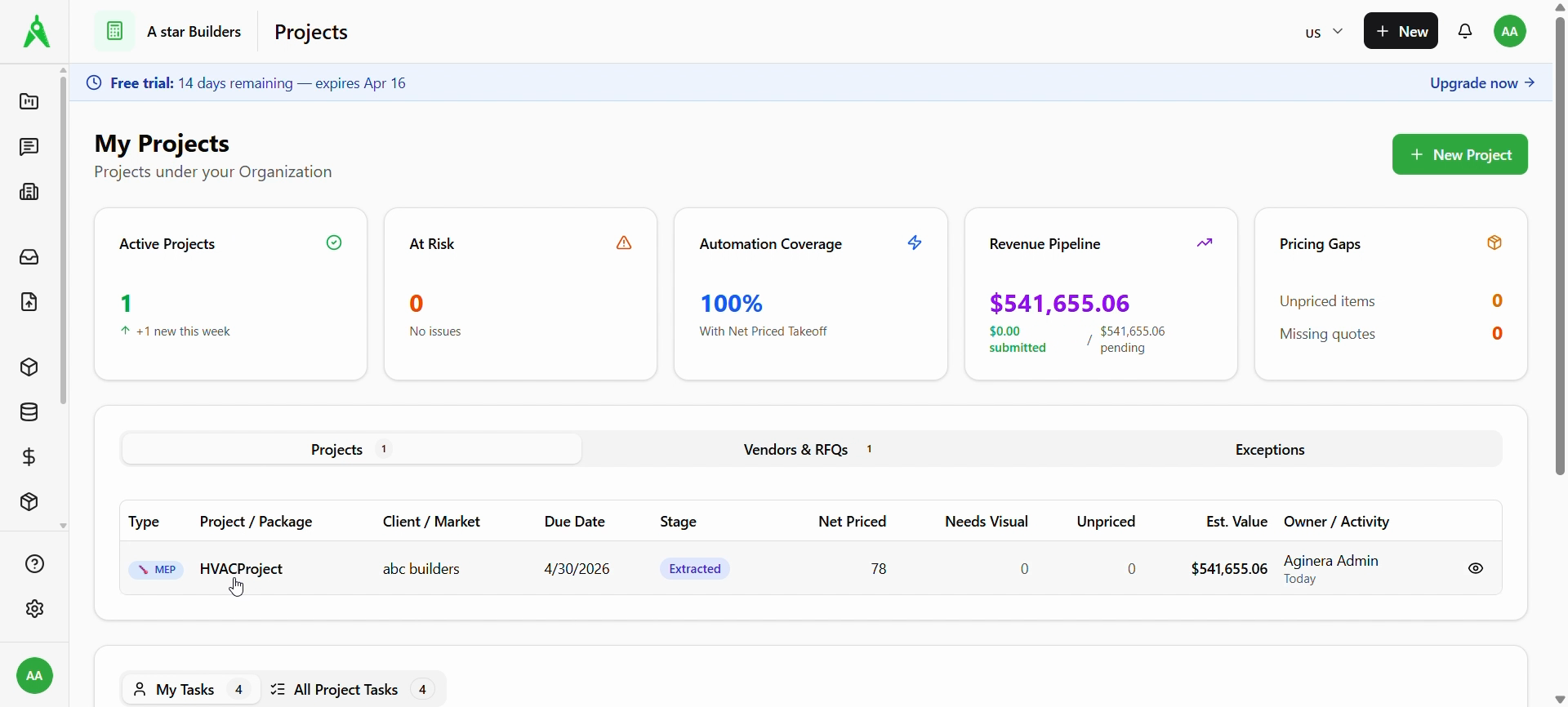From Projects, open the project you want (e.g. click the project name). Use the project header tabs to move between Overview, Documents, Components, Pricing, Estimates, and Schedule.